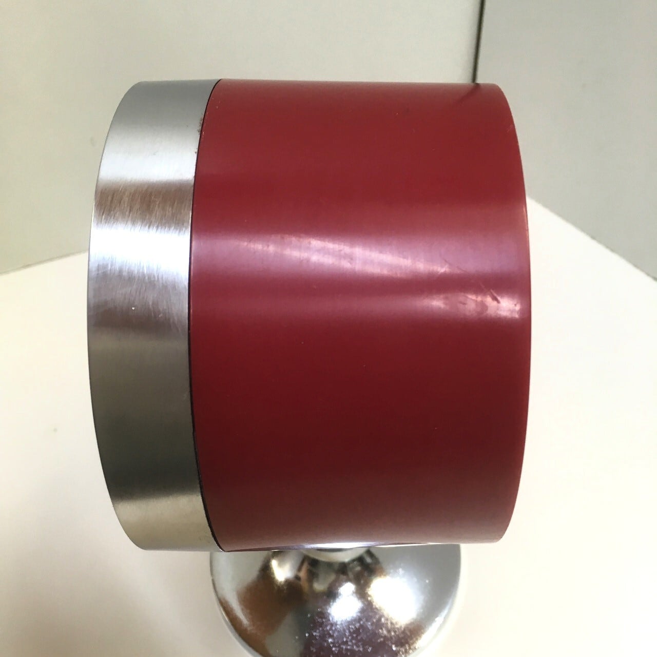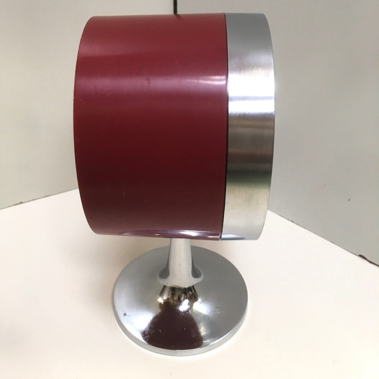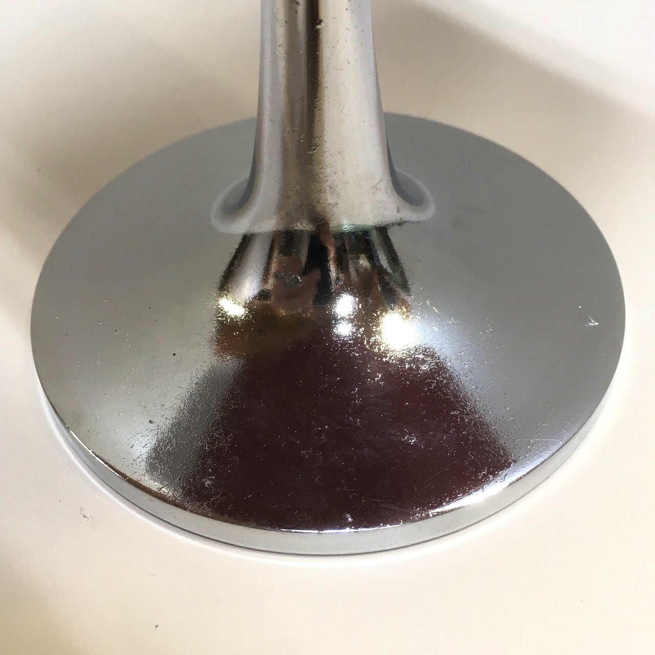 メタリックな文字盤とクロームの脚が